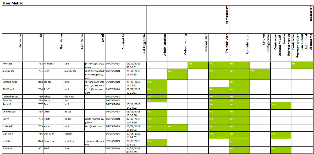 | Matrix Export | A matrix export showing the Access roles assigned to users | Users | Access Roles | |