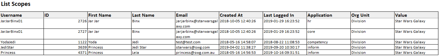 | Scope Export | A list report showing the organisational scoping assigned to users | Users | Information about each users scoping including the module and the value of organisations |