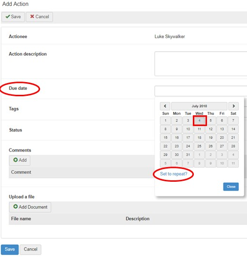 - Click Save to save the action and assign it to the actionee(s).