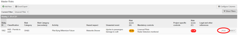Editing a master risk is very similar to editing a risk on the project risk register. To edit master risks, from the Master Risk Page: