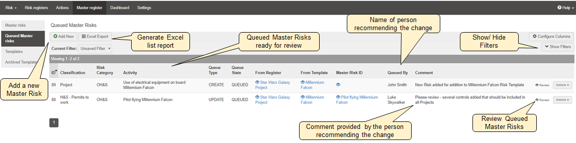 In the Queued Master Risks page, administrators can: