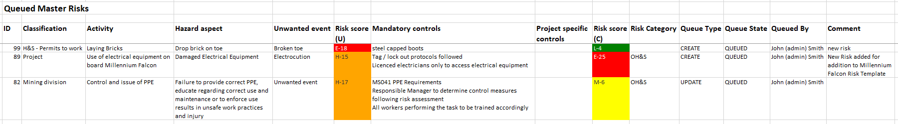 - Reporting from Queued Master Risks