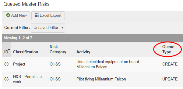 The Queue Type field identifies if a queued risk is a newly created risk or an updated/ edited risk.