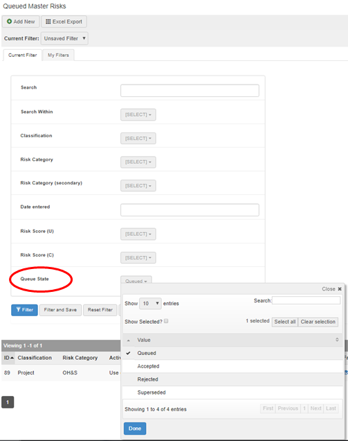 5. Filtering to view processed Queued Master Risks