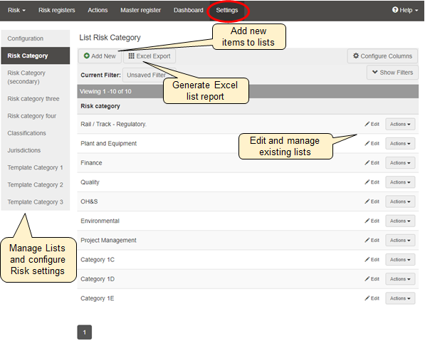 The Settings tab is only available to the system administrator and is where the managed lists that are available within the filters of Lucidity Risk are generated.