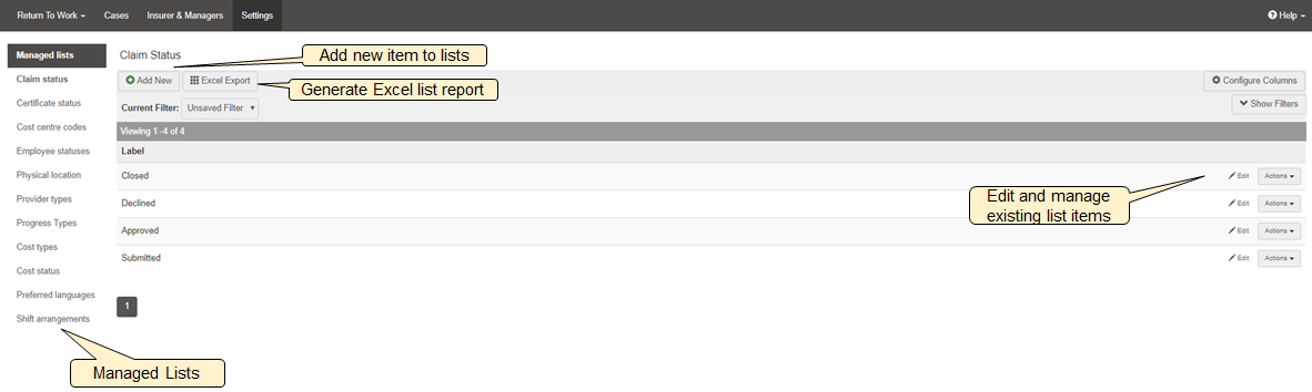 The Settings tab is only available to the system administrator and is where the managed lists that are available within the filters of Lucidity Return to Work are generated.