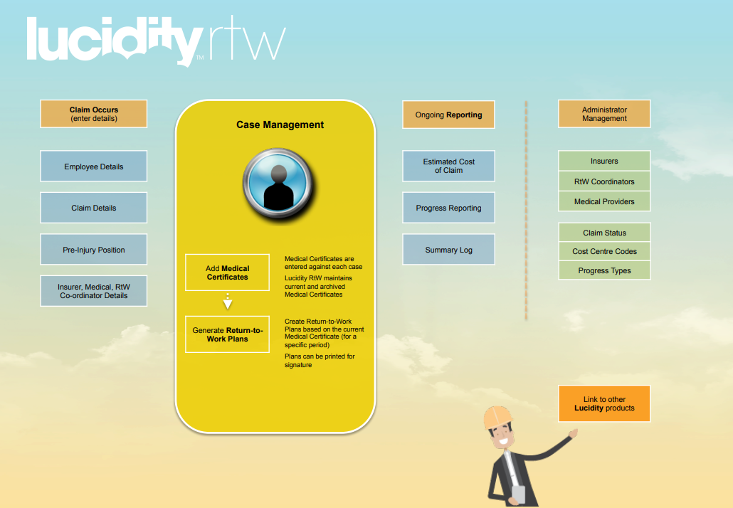 Lucidity Return to Work (RTW) streamlines the process of reintegrating employees following workplace injuries. Designed for ease of use and efficiency, it's an ideal solution for Return to Work coordinators, rehabilitation managers, and workers' compensation managers. Please see Further reading below for more information on Lucidity Return to Work.