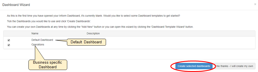 Click Create selected Dashboards.