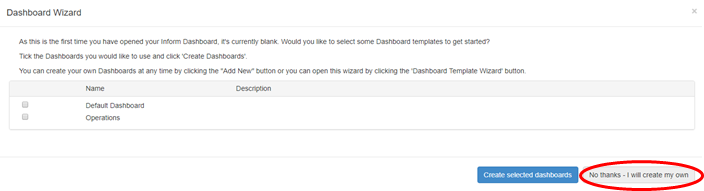 - From the initial dashboard wizard, select No thanks - I will create my own.