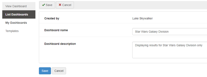 Make changes to the name and description of the dashboard as required.
