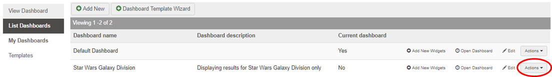 Dashboards can be created by either utilising an existing Dashboard Template created by an administrator or by creating a new one. See the sections below on how to create, edit and manage Dashboards.