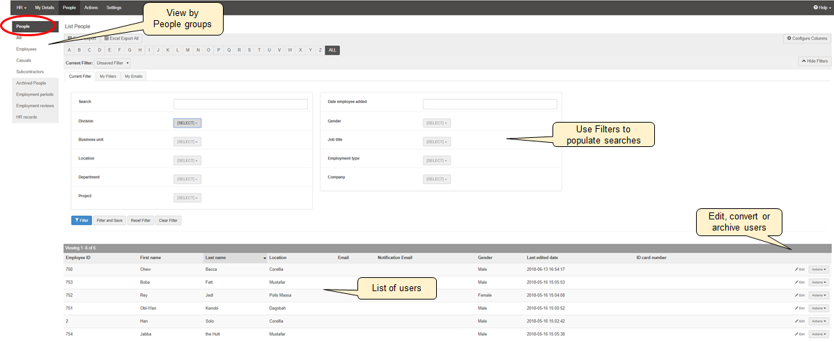 In the People page of Lucidity HR, administrators can: