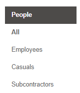 Within the People page, users are categorised by people types - employees, casuals and subcontractors. Users can be found either via searching on the All page or via the specific Person Type page.