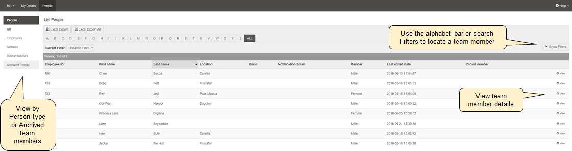 | Manager | Using HR, a user can view and edit employees, casuals and subcontractors (cannot add, delete or archive); run reports and manage actions. |