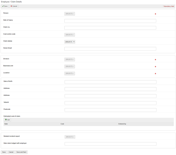In this section, enter basic employee information including organisation, basic injury information, home address details and any related incident report.