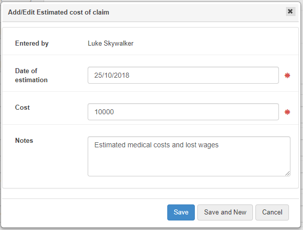 Use the Add button to enter details for any estimated costs associated with the claim. More than one entry can be made, and each entry can be edited as required. There is a separate section in the case where actual costs are recorded. |