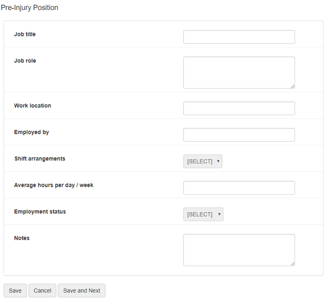 In this section, enter details regarding the employment position held by the person pre-injury.