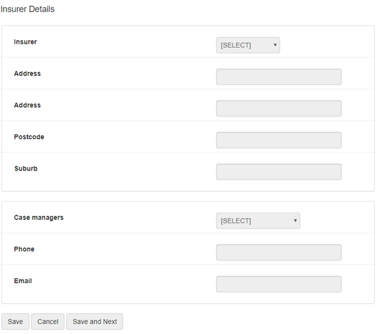 Details for insurers and case managers can be entered and edited via the Insurers and Managers tab. Note that each insurer has a list of associated case managers and it is not possible to select a case manager who is not associated with the selected insurer.