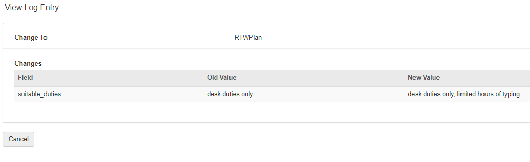 - Each field from the section will be listed, along with the old value compared to the new value. In the example below, the field of Suitable Duties from the RTW Plan has been updated to include limited hours of typing only.