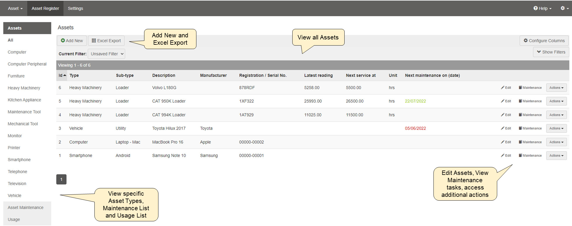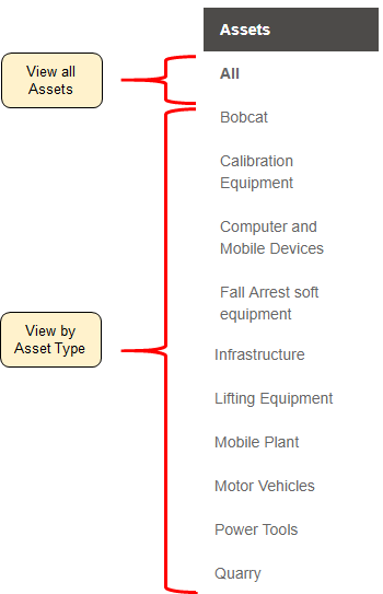 All Assets are viewable from the 'All' menu, whereas individual asset types are viewable as individual registers as required.