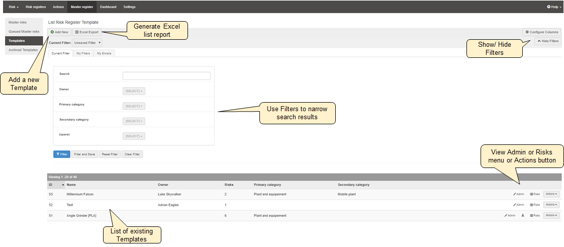 Templates are used to group master risks together for use within project risk registers. Each template will become a risk grouping within the project risk register and can be renamed within the project risk register to suit the stages or terminology being used within the project if required.