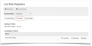 Any saved filters can be easily accessed via the current filter drop down selection option above the Filter tabs. This is a short-cut route for applying saved filters.