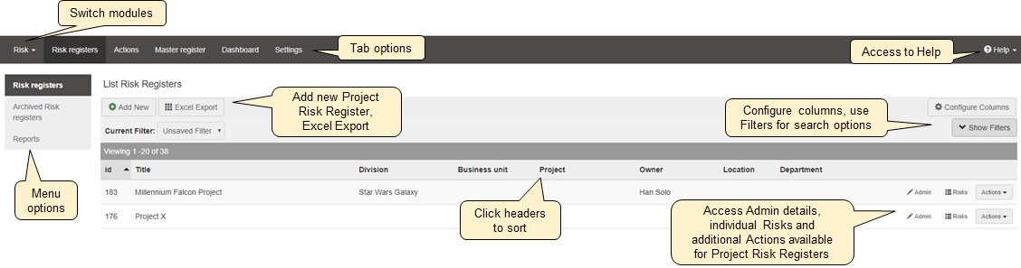 - Actions: Manage unprocessed risks, copy, archive or delete the project risk register.