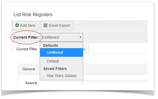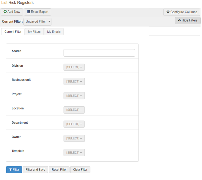 Filters on the Risk Register page comprises of one main section. Any field with the [SELECT] option denotes a list will be displayed to select from. Options in these lists are pre-populated according to system configuration. Multiple options in multiple filters for a single search can be selected.
