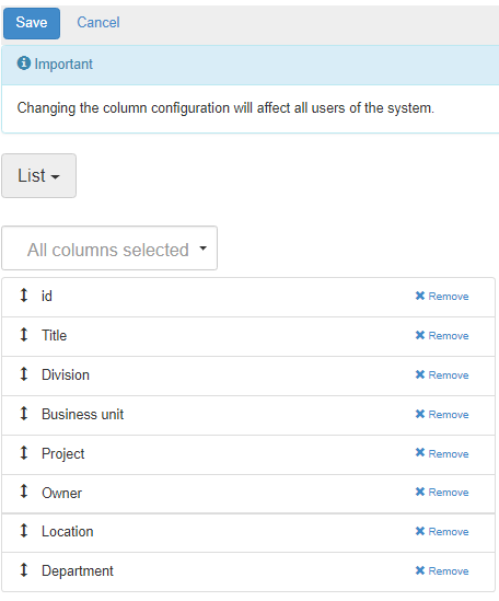Columns within each page of Lucidity Risk as well as those displayed in reports can be manipulated by the system administrator. The columns displayed as well as the order in which they are displayed can be adjusted. It is important to remember that changes made to columns affect all users viewing the pages or running reports.