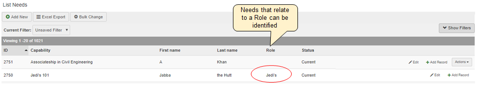 Needs that relate to a role can be identified from the list of needs by checking the roles column - where they need was created as a result of a role; the role title is listed in the column.