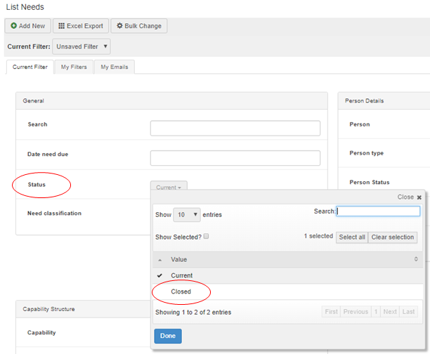 Filters may need to be used to view closed needs from the Needs page as they are often hidden by default.