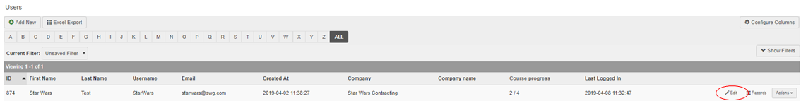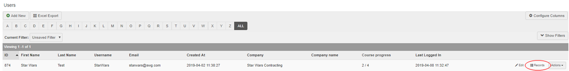 User course records can be viewed from the Records page as well as directly from the user account in the User page.