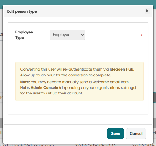 Converting a user will re-authenticate them via Ideagen Hub. Allow up to an hour for the conversion to complete.