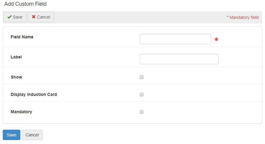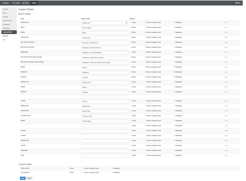 Tick if this field is to be printed (with the populated details from the user) on a user's induction card. It is advisable to keep the number of fields showing in the induction card to a minimum to avoid over complicating the card and for privacy issues. |