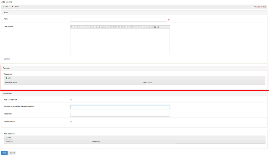 A module must have at least one resource as this is the content the user will view or be directed to. Several resources can be added to a single module if required. For example, a module may consist of Part A and Part B. Or there may be a PPT, a video, an interactive presentation and a link to a procedure stored in the organisations Intranet. Resources will be displayed to the user in the order displayed in the list.