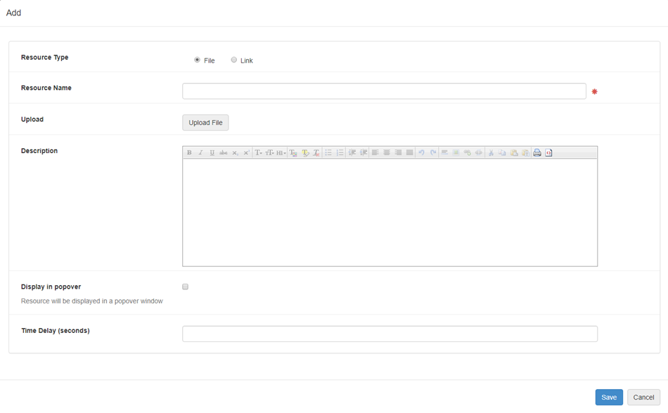 Enter time delay in seconds. The time delay inserts a pause before the close button appears. In other words, setting a time delay can help prevent a user from closing the resource before completing it. The close button is disabled until the time delay is reached. If the resource is not SCORM, depending upon the number and length of the slides/ presentation format, it is recommended to set the time delay for at least 2 minutes. This feature can only be utilised in conjunction with the Display in Popover option. |