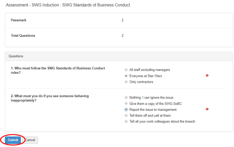 Assessments can be configured differently. A pass mark of 100% may be required for some assessments for example, whilst others may only require a pass mark of 80%. All questions will be multiple choice, with only one correct answer.