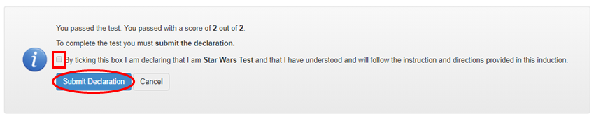 The completion of modules will not be registered until the declaration box has been ticked and submitted, even if all modules have been viewed and assessments passed.