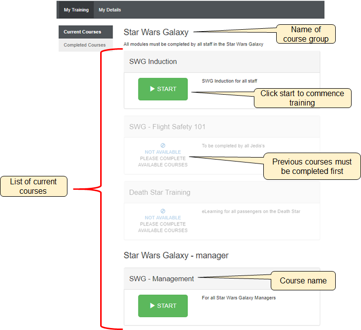 The My Training tab is where current and completed courses are displayed and accessed. Any eLearn courses required to be completed will be displayed on the My Training tab in the Current Courses page. Partially completed courses will also be listed. Some courses may have pre-requisite requirements.