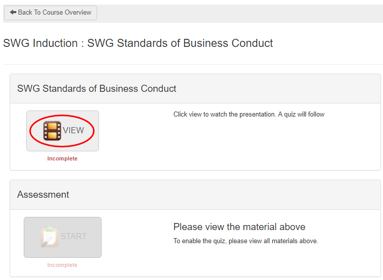 - Some modules may contain an assessment. Assessments can't be completed until the modules has been viewed. Click View.