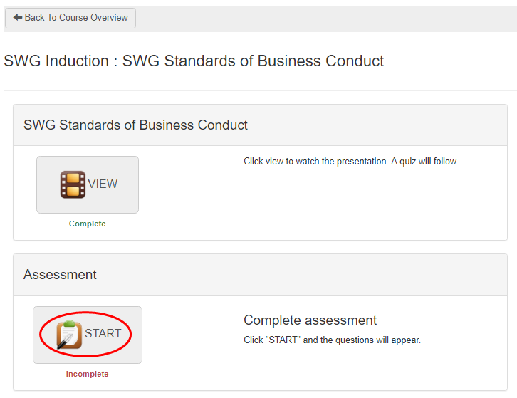 - Once the module has been viewed successfully, the assessment will become available, click Start.