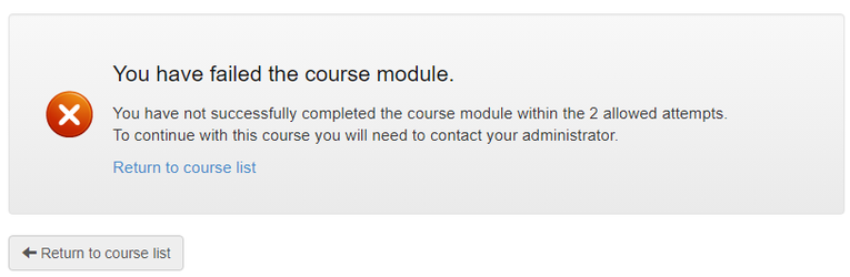Assessments may have a limited number of attempts a user can unsuccessfully take before the course is marked as failed. For example, if the number of attempts is set to 2, the user would need to fail the assessment twice before the entire course is marked as failed. When a course is failed, the user can no longer reattempt it and will need to contact an administrator for assistance.
