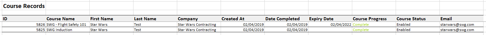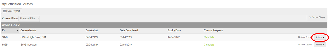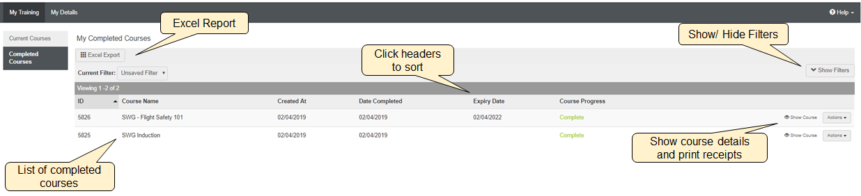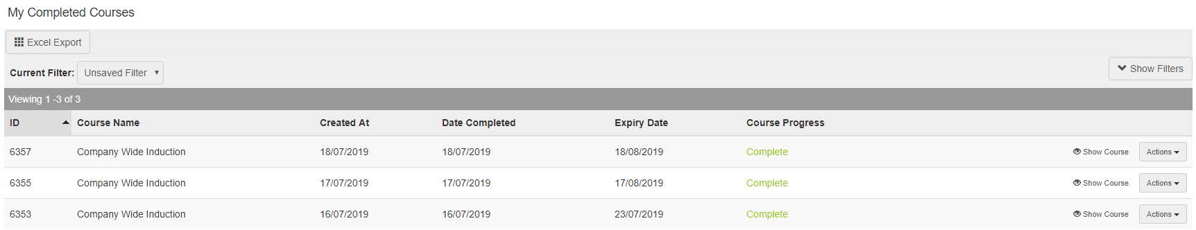 Courses with expiry rules will become available to users to re-complete 30 days prior to the course expiring. The course will appear in the users My Training tab and exactly the same completion steps are followed as listed above. The historical record will not be deleted. The user will retain several records for the single course, one for each completion date, as per the example below.