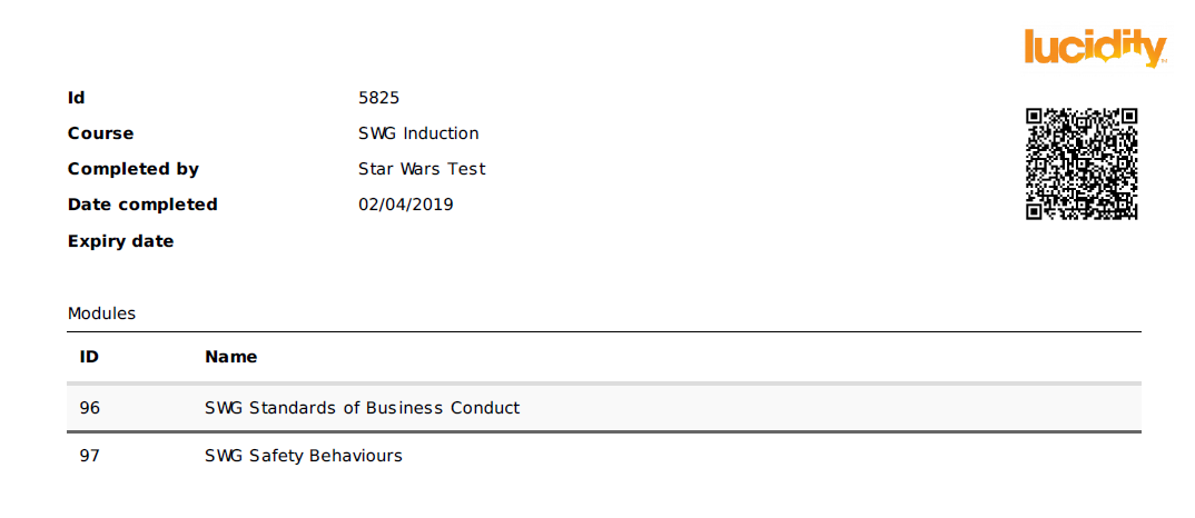 - Print Induction Card - prints an induction card showing user details, course group completed and a signature space.