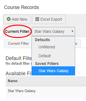 Any saved filters can be easily accessed via the Current Filter drop down selection option above the Filter tabs. This is a short-cut route for applying saved filters.