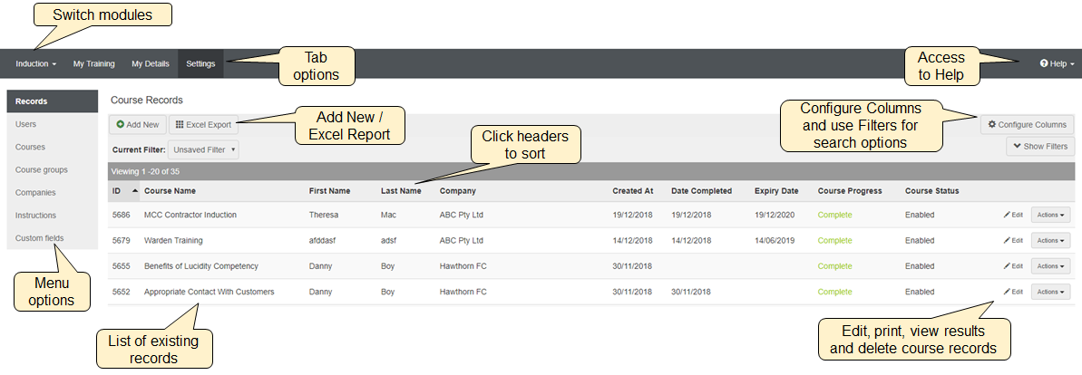 - Settings: Administrator access to user records and details, courses and course groups, companies and self-registration instructions and requirements.
