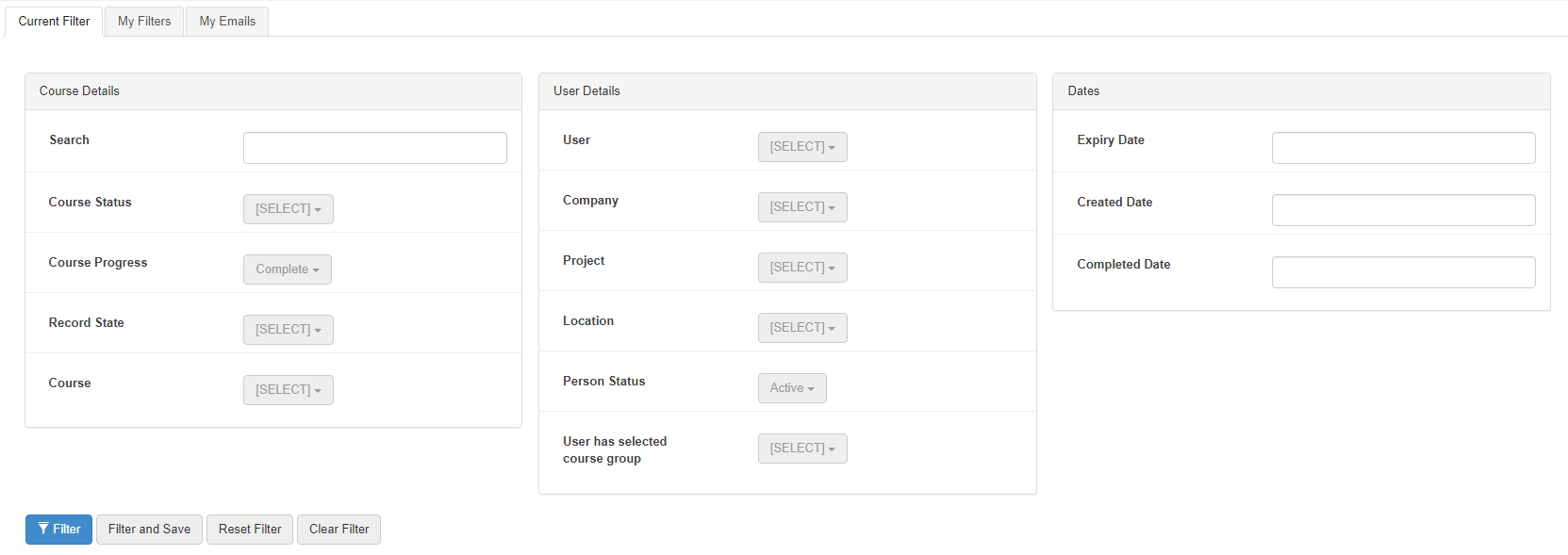 - Course Details: Filter by course details such as course status and course progress.