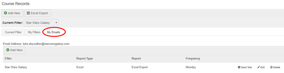 Automatically emailed reports can be specified using the My Emails feature.