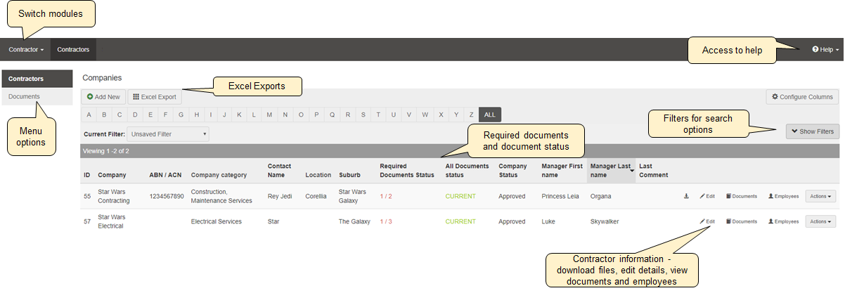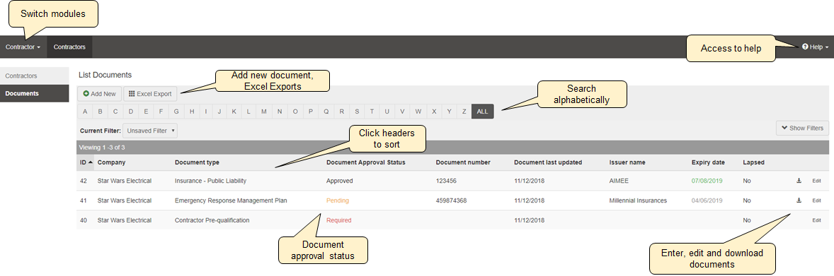 Using Contractor, a contractor representative can add, view and download documents and view all subcontractor details and limited contractor details (scoping required to specific company). |