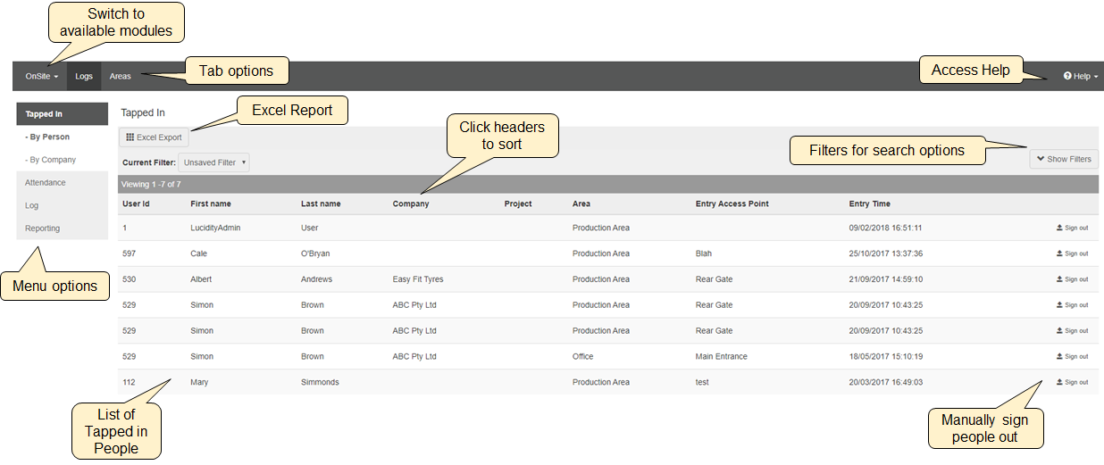 - Tapped in: View current personnel on site organised either by company or by person.